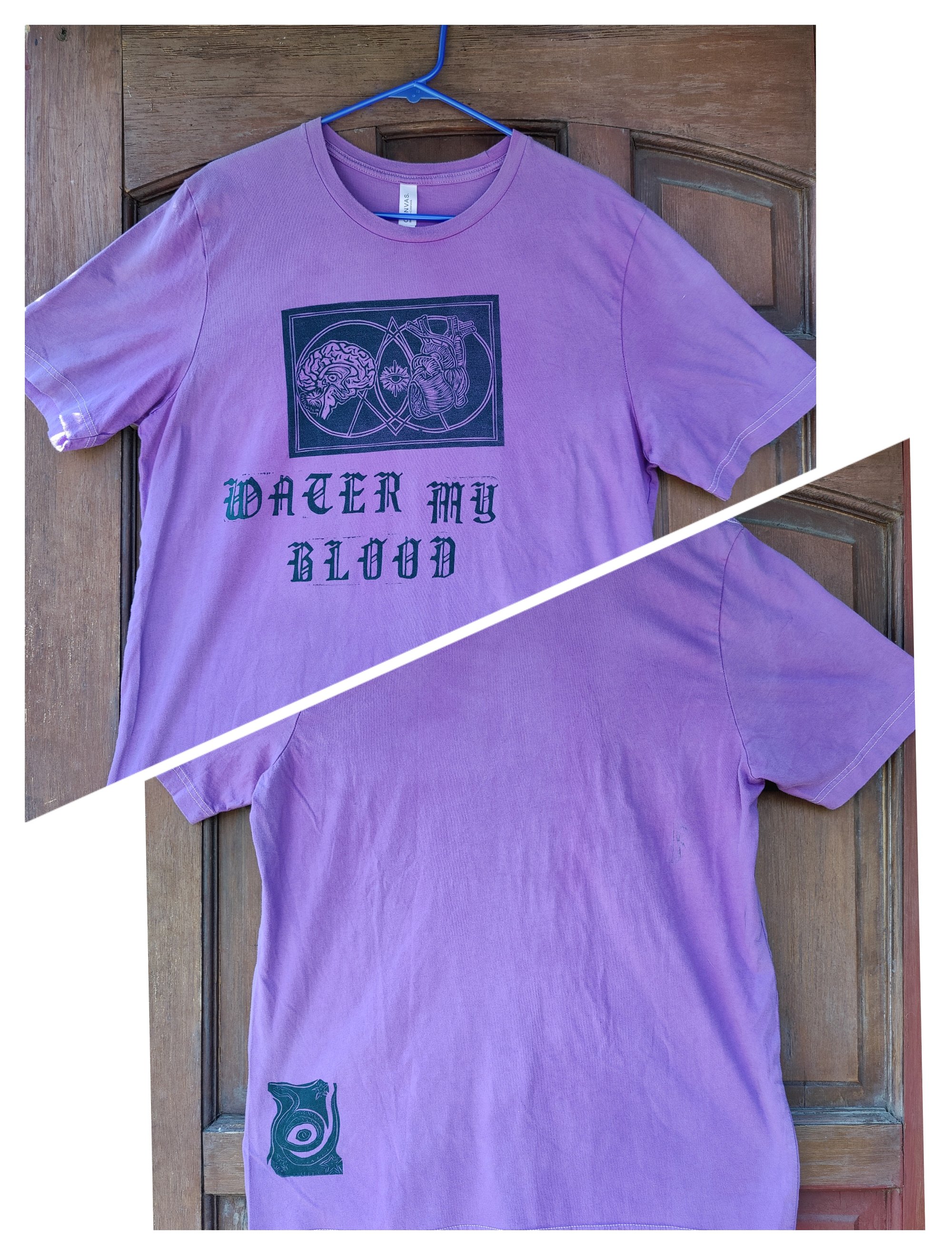 XL 100% Cotton T-Shirt. Unique 1 of 1 from The Living Altar Series. Water My Blood. Light Purple, printed with linocut with dark blue ink.