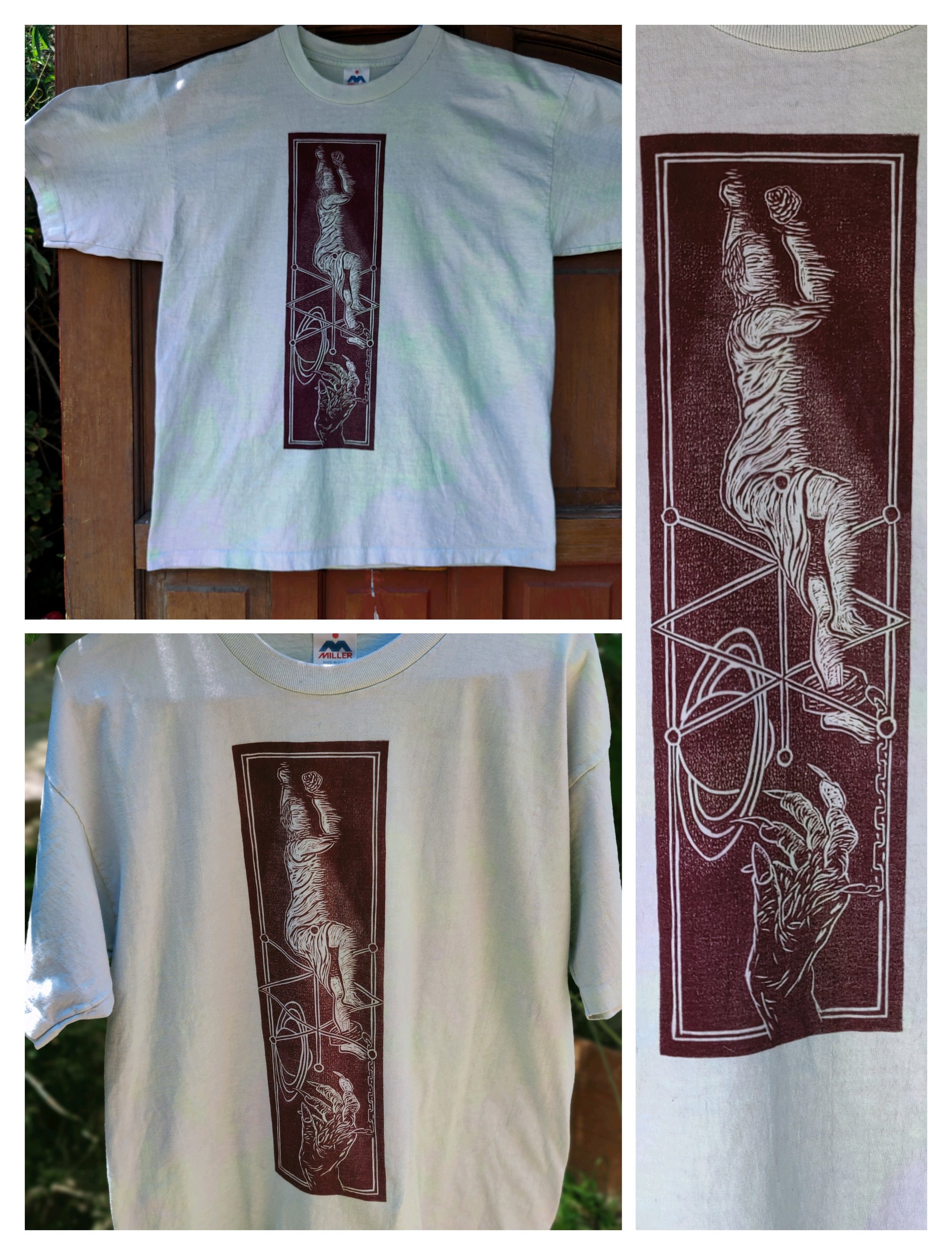 XL 100% Cotton T-Shirt. Unique 1 of 1 from The Living Altar Series. White with light green tie-dye. Printed with Linocut and dark red ink.